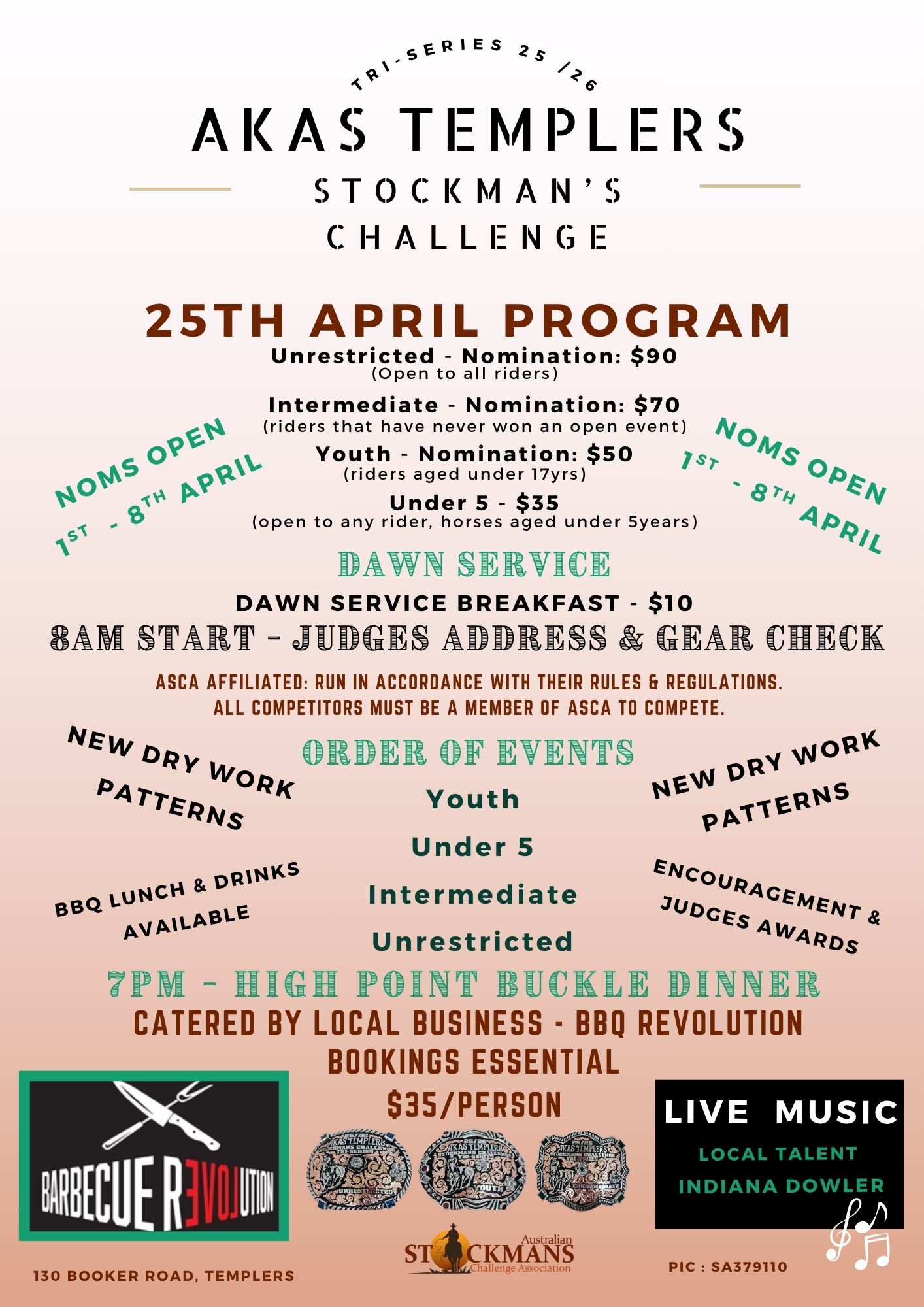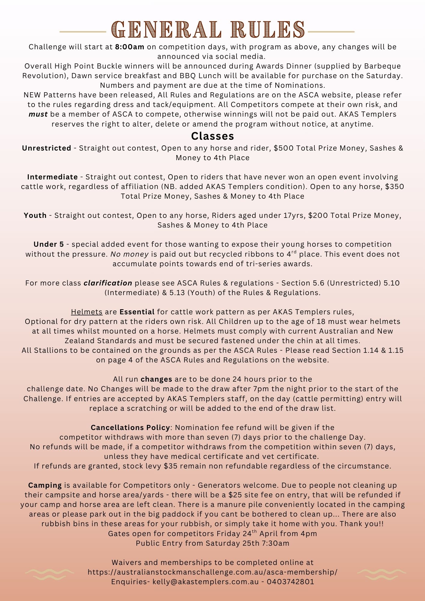 2 Phase Event for Junior Youth and Unrestricted. You must be a member of the ASCA to enter, memberships are available on the website or you can nominate to have a weekend single event membership.